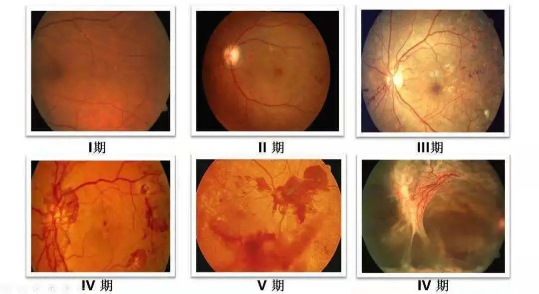 DR从轻到重分为6个期,Ⅰ期、Ⅱ期、Ⅲ期为非增殖性糖尿病视网膜病变(NPDR),Ⅳ期、Ⅴ期、Ⅵ期为增殖性糖尿病视网膜病变(PDR),两者主要区别为视网膜有无异常新生血管。